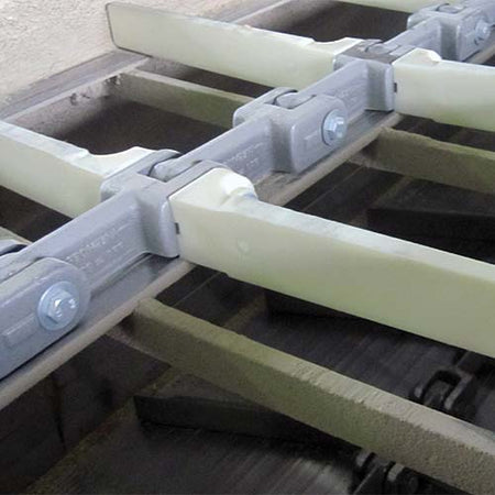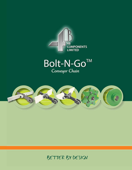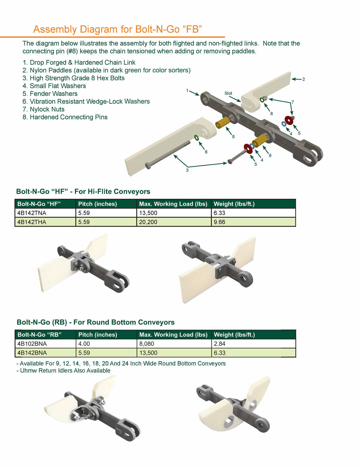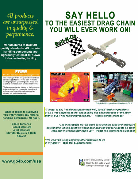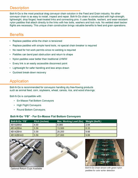 Bolt-N-Go is the most practical drag conveyor chain solution in the Feed and Grain industry. No other conveyor chain is as easy to install, inspect and repair. Bolt-N-Go chain is constructed with high-strength, lightweight, drop forged, heat-treated links and connecting pins. It uses flexible, resilient, and wear-resistant nylon paddles that attach directly to the links with hex bolts, washers and lock nuts. No welded steel backer flights are necessary. This unique chain construction brings valuable benefits to feed and grain operations. Bolt-N-Go is recommended for conveyors handling dry free-flowing products such as animal feed, corn, soybeans, wheat, canola, rice, and wood shavings.