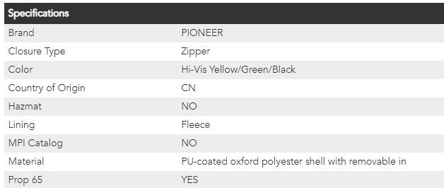 Heavy duty coat can be worn as rain or snow work gear and has 2 large zipper pockets, a cell phone pocket, inside chest pocket, radiophone clip straps, a 2-way zipper, and elastic ribbed wrist cuffs and waist