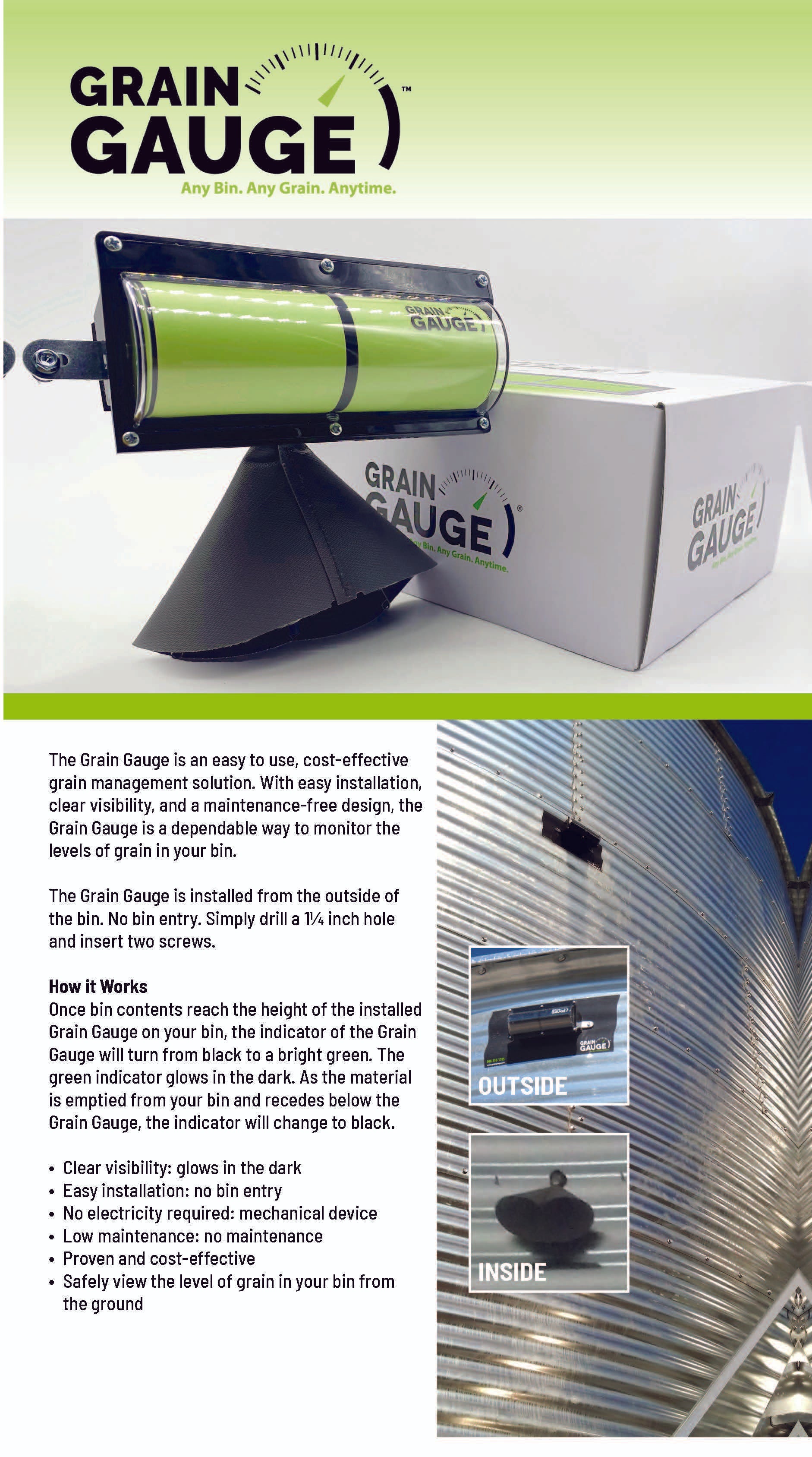 The Grain Gauge is an easy to use, cost-effective grain management solution. With easy installation, clear visibility, and a maintenance-free design, the Grain Gauge is a dependable way to monitor the levels of grain in your bin.