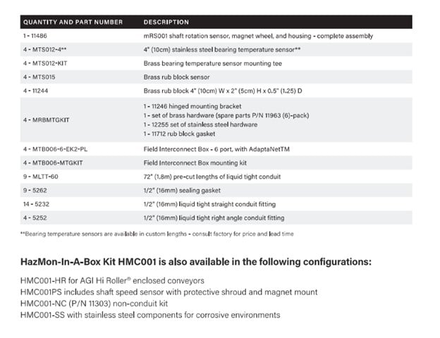 Included in this kit are all of the components required to install hazard monitoring on a basic belt conveyor or bucket elevator.