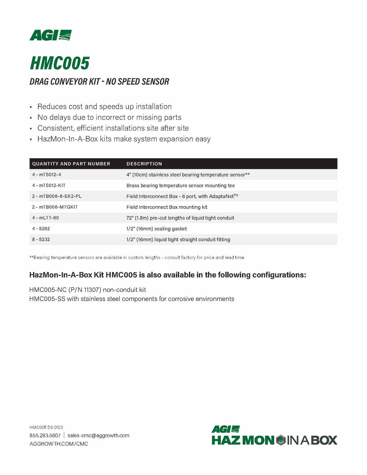 Included in this kit are all of the components required to install hazard monitoring on a drag conveyor.