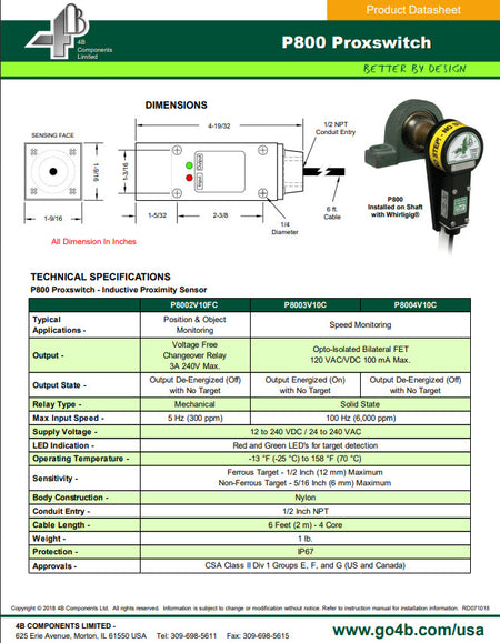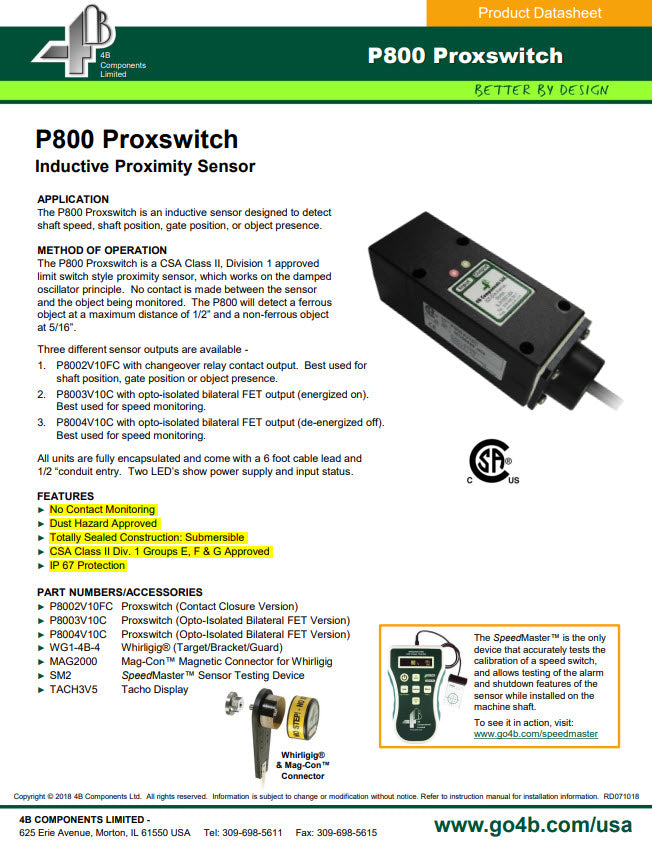 The P800 Proxswitch is a CSA Class II, Division 1 approved limit switch style proximity sensor, which works on the damped oscillator principle. No contact is made between the sensor and the object being monitored. The P800 will detect a ferrous object at a maximum distance of 1/2” and a non-ferrous object at 5/16”